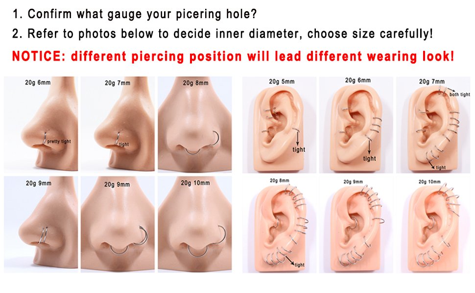 | 1 | Sold individually Nose Hoop Ring/Earring Hoop ,Please choose your gauge and diameter hoop for your nose piercing needs.It has a smooth closure that doesn't slipped or opened. It's still tight after long-term use. |